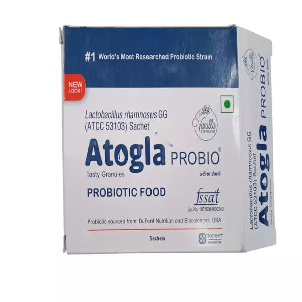 Atogla Probio Sachet 0.75 gm is a probiotic used to treat diarrhoea, antibiotic-associated diarrhoea, to improve and restore the natural microflora. It may also be used in the treatment of irritable bowel syndrome and inflammatory bowel disease. Diarrhoea is the condition in which there is a frequent need to empty the bowels.