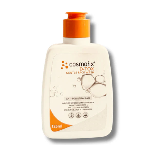 Choose COSMOFIX D-TOX GENTLE FACE WASH to defend against pollution, replenish lost moisture, and support overall skin health. It's a scientifically advanced blend of anti-pollution hyaluronate, Biosaccharide Gum-4, and colloidal oatmeal that works synergistically to soothe and repair the skin, ensuring every wash leaves your complexion clean, calm, and resilient. Ideal for those seeking a daily cleanser that gently but powerfully cares for every skin type.