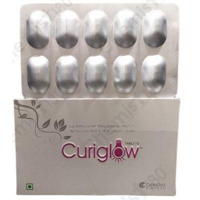 Curiglow tablets, manufactured by Curious Biotech, are a dietary supplement containing vitamins, minerals, and antioxidants, often used to support overall health and well-being.