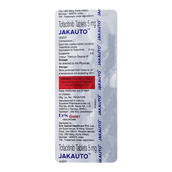 Jakauto 5mg Tablet is used to treat moderate to severe rheumatoid arthritis, psoriatic arthritis, ankylosing spondylitis, and ulcerative colitis. It helps decrease pain, tenderness, and swelling in the joints by reducing inflammation. It also helps slow the progression of bone and joint damage.