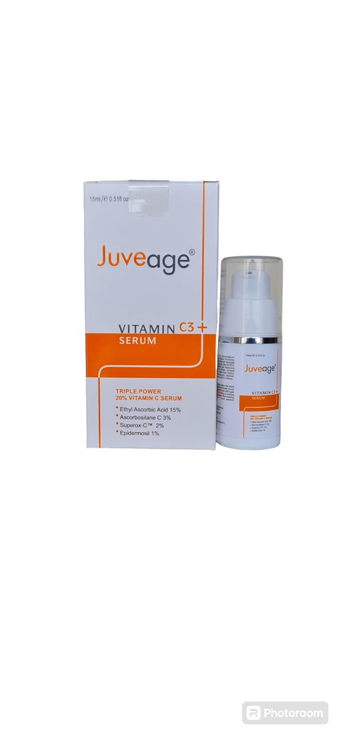 Juveage vitamin c3+ serum contains ethyl escorbic acid, pectin ate, superox-c, camelia sine sis, leaf extract, glabfa root extract, allatonin is helpful for skin lightening and rejuvenation