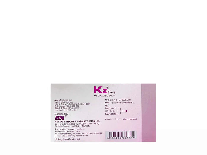 Kz Plus Medicated Soap contains Ketoconazole (2% w/w) as the active ingredient, which is an antifungal agent. It is used to treat various fungal infections such as athlete’s foot, ringworm, and thrush. The soap works by eliminating the fungus causing the infection and prevents it from spreading. Regular use as prescribed ensures effective results, helping keep the skin clear and healthy.