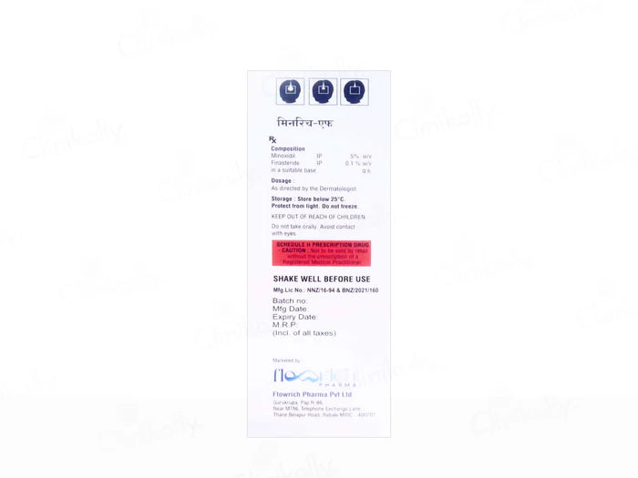 Minrich F Topical Solution is a specialized formulation designed to promote hair growth and improve scalp health. This solution typically contains active ingredients that work to nourish hair follicles, enhance blood circulation to the scalp, and prevent hair thinning. Minrich F is often used to address conditions such as androgenetic alopecia and other forms of hair loss. Its lightweight, non-greasy formula makes it suitable for regular use.