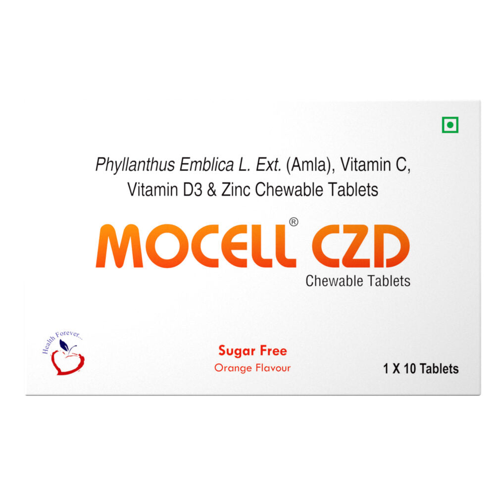 Mocell CZD is a chewable tablet containing Phyllanthus Emblica L. Ext. (Amla), Vitamin C, Vitamin D3, and Zinc. This combination is designed to boost immunity and address deficiencies in these vitamins and minerals.