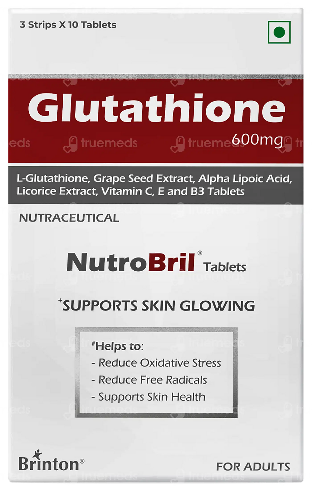 Nutrobril Tablet is used for supporting multiple aspects of health through essential vitamins, potent antioxidants, and beneficial herbal extracts. This formulation focuses on promoting skin health, enhancing immune function, helping cognitive performance, and maintaining cardiovascular health. It contains L-Glutathione, a powerful antioxidant, which may help protect cells from oxidative stress and promote a healthy complexion by encouraging the production of lighter melanin pigments. It also features Grape Seed Extract, which is rich in polyphenols and supports cardiovascular health. The tablet also may offer protection against free radical damage. Alpha Lipoic Acid, as one of the ingredients enhances the effectiveness of other antioxidants and supports nerve health, supporting cognitive function and metabolic health.