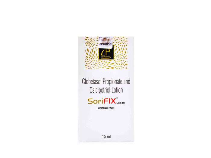Sorifix Lotion is a topical treatment combining calcipotriol and clobetasol propionate for effective relief from psoriasis and other skin conditions involving scaling, inflammation, and redness. This lotion is paraben-free, fragrance-free, and clinically proven to provide targeted treatment for affected areas. The potent formulation helps control cell turnover, reduce scaling, and manage irritation, offering visible relief with consistent use as directed by a healthcare professional.