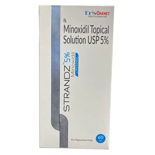 Strandz 5% Solution is a medication containing the active ingredient Minoxidil. It is commonly used to treat hair loss, particularly in cases of male pattern baldness and female pattern hair loss. This easy-to-apply solution revitalizes hair follicles, increasing hair density and thickness. It's a reliable choice for regaining a fuller, more youthful head of hair and boosting self-confidence.
