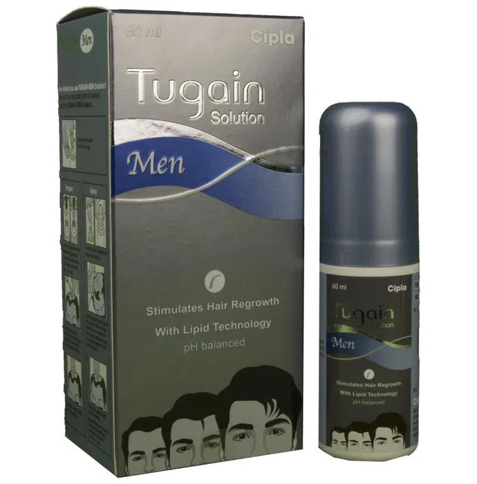 Tugain Men 5% Solution is a combination medicine used in the treatment of hair loss in men. It works by increasing blood flow to the hair follicles which further prevents hair loss and stimulates re-growth resulting in longer, thicker and increased numbers of hair.