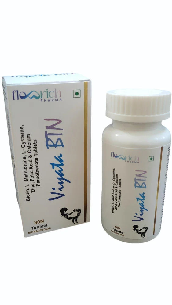 Viyata BTN is a nutritional supplement that primarily contains biotin, along with other ingredients like L-methionine, L-cysteine, zinc, and folic acid. It's marketed to promote healthy hair, nails, and skin. Viyata BTN aims to improve hair structure, reduce brittleness, and support nail and skin health.
