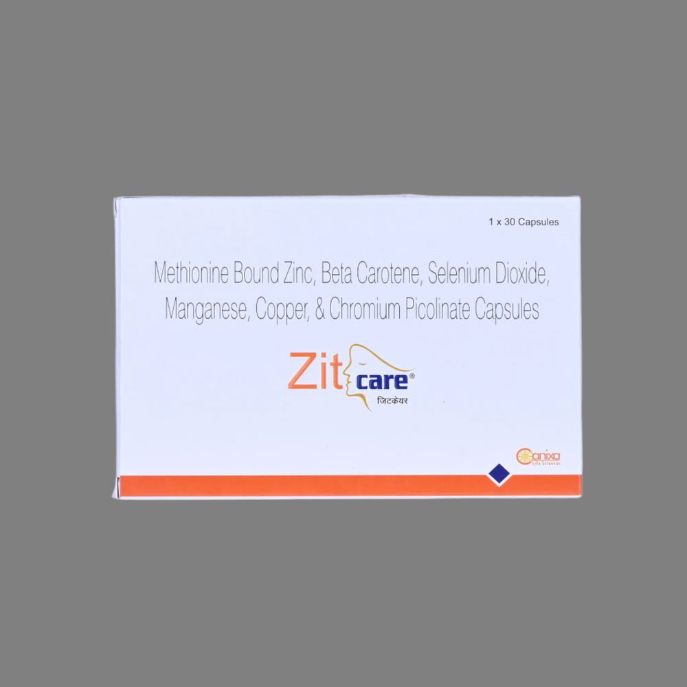 Zitcare capsule is a nutritional supplement that relieves acne and modulates the immune system. It contains Methionine bound zinc complex, Selenium dioxide, Magnesium sulphate, Chromium picolinate, Beta carotene and Copper sulphate as active ingredients which protect skin cells and prevents skin damage